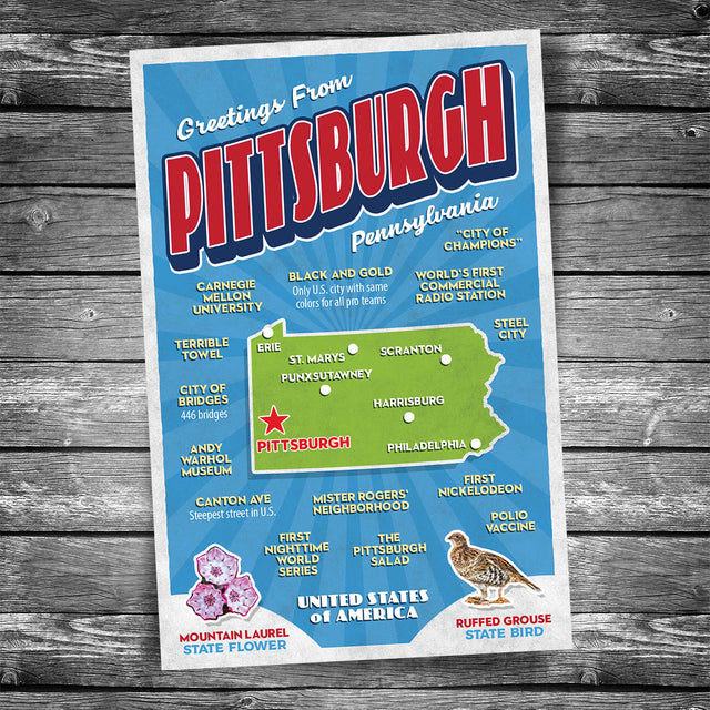 This “Greetings From” custom postcard highlights Pittsburgh, PA with: