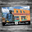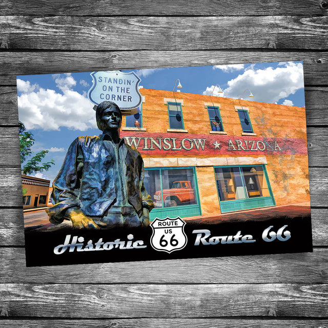 Once filled with Route 66 travelers, when Winslow, AZ was by-passed by interstate I-40, the town stood frozen in time—until the Eagles rock band recorded a hit song that included the lyric "Well, I'm a standing on a corner in Winslow, Arizona and such a fine sight to see. It's a girl, my Lord, in a flatbed Ford slowin' down to take a look at me." Today the corner park includes a bronze statue with a painted mural depicting the lyrics of the song.