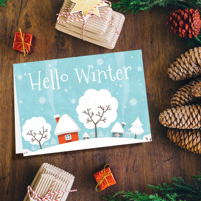 Delight family and friends with this charming winter illustration, featuring a cozy village scene and the words "Hello Winter" written above in a playful font.