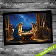 Celebrate the true meaning of Christmas with this beautiful postcard depicting the manger scene at the birth of Christ. The Christ child rests peacefully in a straw-filled manger, while Mary and Joseph kneel beside Him in reverent worship. Shepherds peek around the doorway in awe, capturing the wonder of that holy night, with a gentle donkey adding to the serene atmosphere. This card is a heartfelt way to share the spirit of the season with your loved ones.