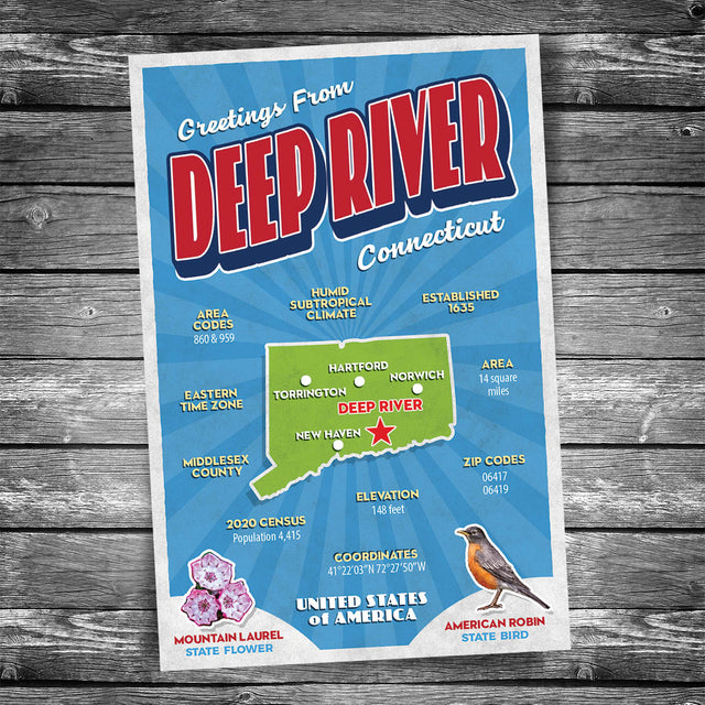 This “Greetings From” custom postcard highlights Deep River, CT with: