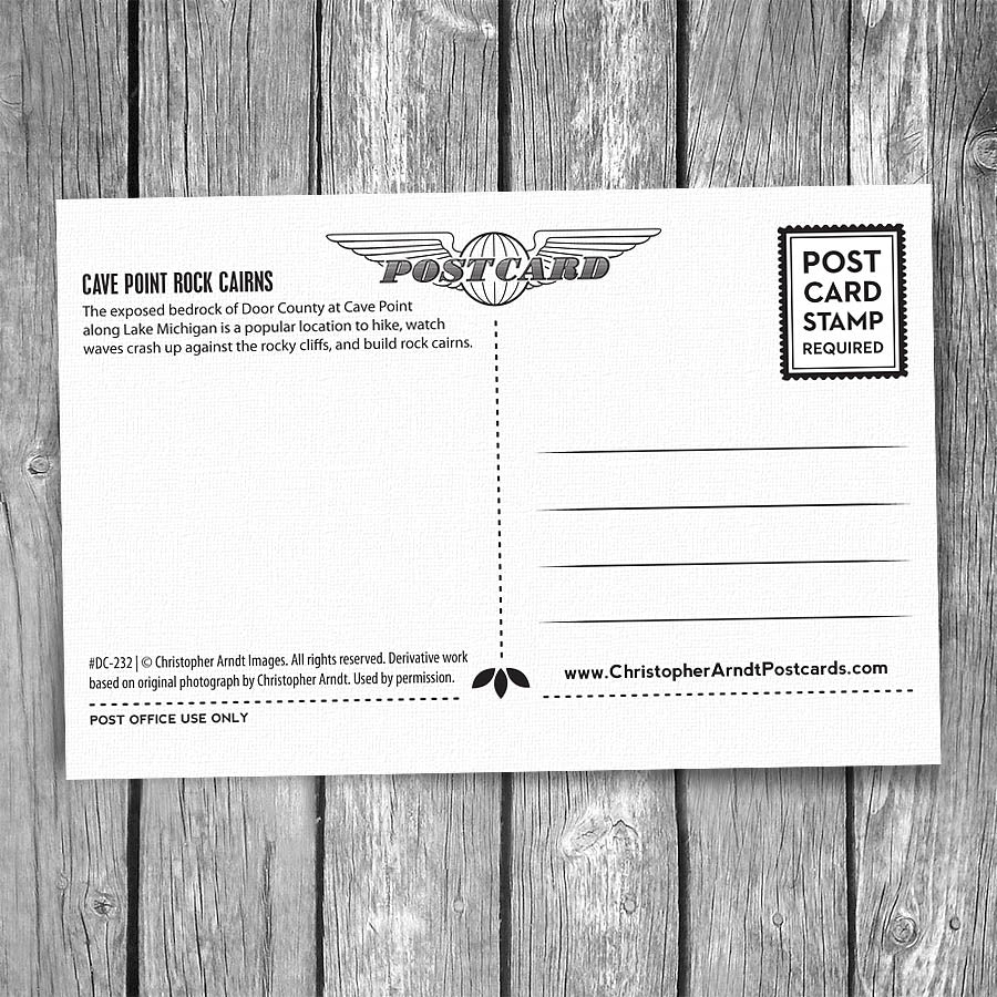 The exposed bedrock of Door County at Cave Point along Lake Michigan is a popular location to hike, watch waves crash up against the rocky cliffs, and build rock cairns.