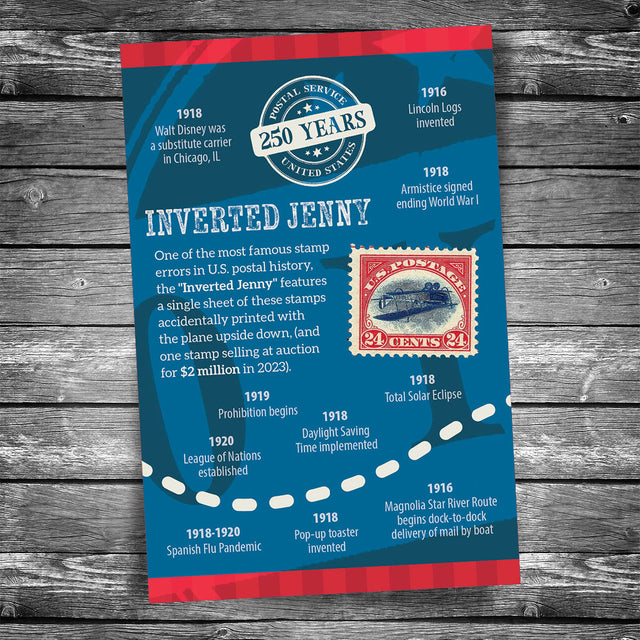 The Inverted Jenny is one of the most famous and valuable postage stamps in the world. Issued in 1918 to commemorate the launch of the first regular airmail service, the stamp features a Curtiss JN-4 "Jenny" biplane. Due to a printing error, the airplane appears upside down on the stamps.