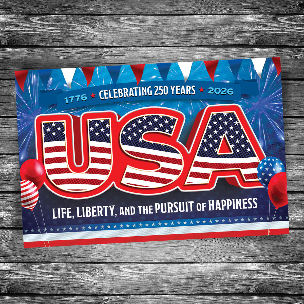 Commemorate 250 years of American history with this beautifully crafted postcard—a tribute to the ideals of liberty, self‑government, and opportunity that continue to shape our nation. Whether you send it, frame it, or keep it as a reminder, this postcard lets you celebrate America’s enduring story of freedom and innovation in a meaningful way.