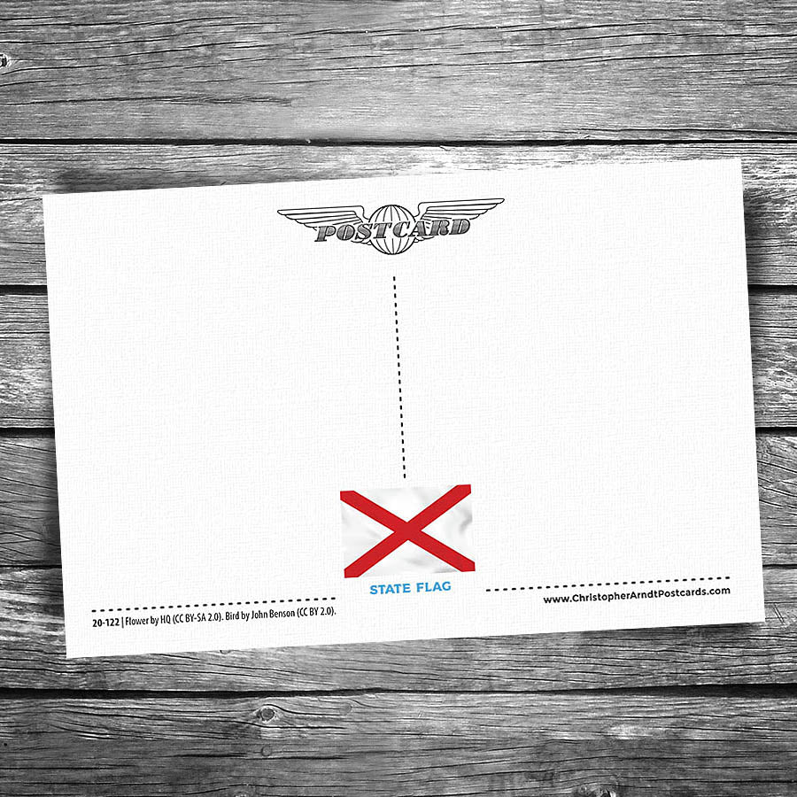 Large letter "Greetings From" Alabama postcard featuring fun facts & trivia – plus the state flower, bird, and flag in a vibrant patriotic design.