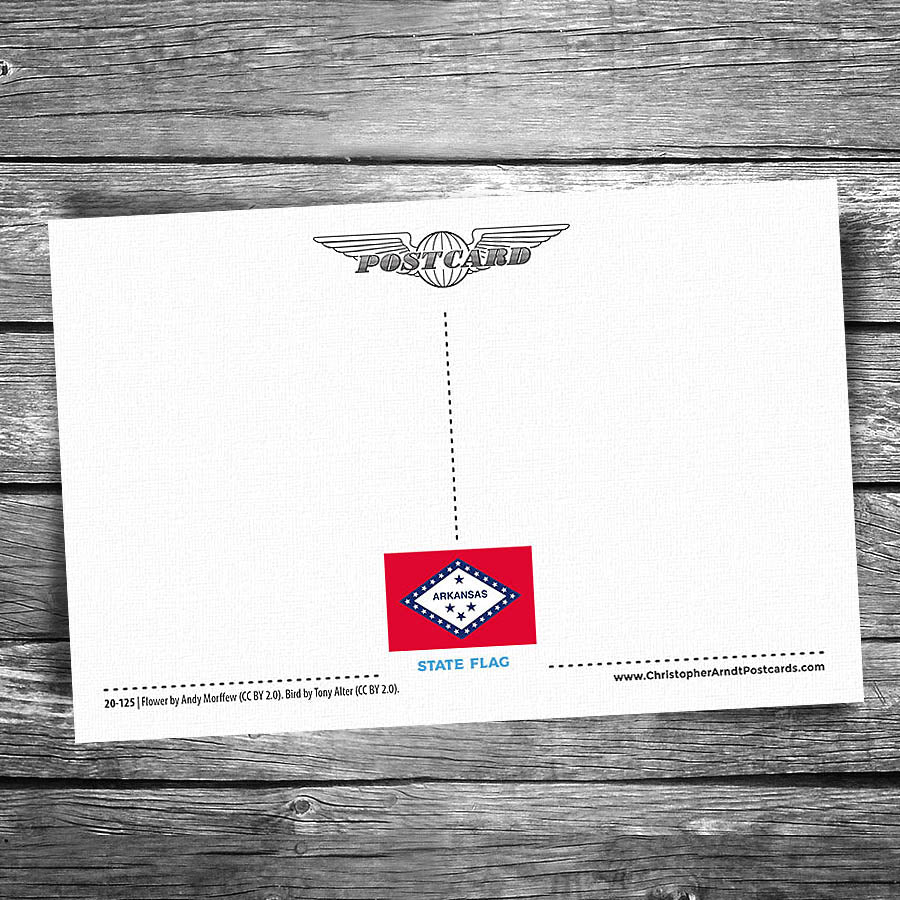 Large letter "Greetings From" Arkansas postcard featuring fun facts & trivia – plus the state flower, bird, and flag in a vibrant patriotic design.