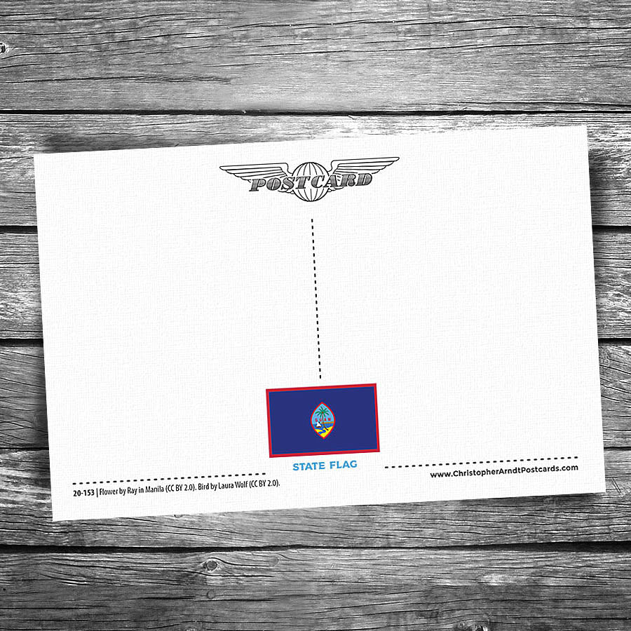 Large letter "Greetings From" Guam postcard featuring fun facts & trivia – plus the territory flower, bird, and flag in a vibrant patriotic design.