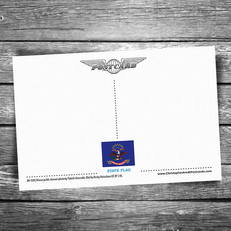 Large letter "Greetings From" North Dakota postcard featuring fun facts & trivia – plus the state flower, bird, and flag in a vibrant patriotic design.