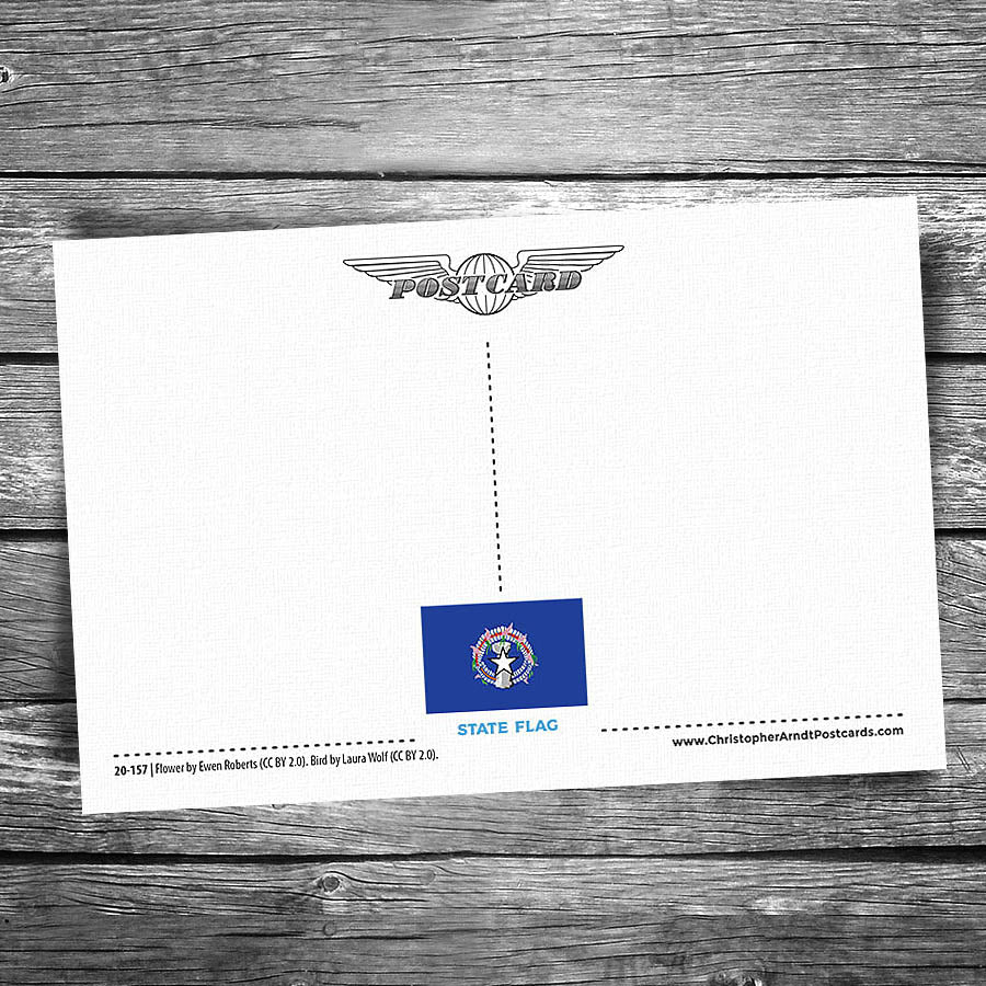 Large letter "Greetings From" Northern Mariana Islands postcard featuring fun facts & trivia – plus the territory flower, bird, and flag in a vibrant patriotic design.