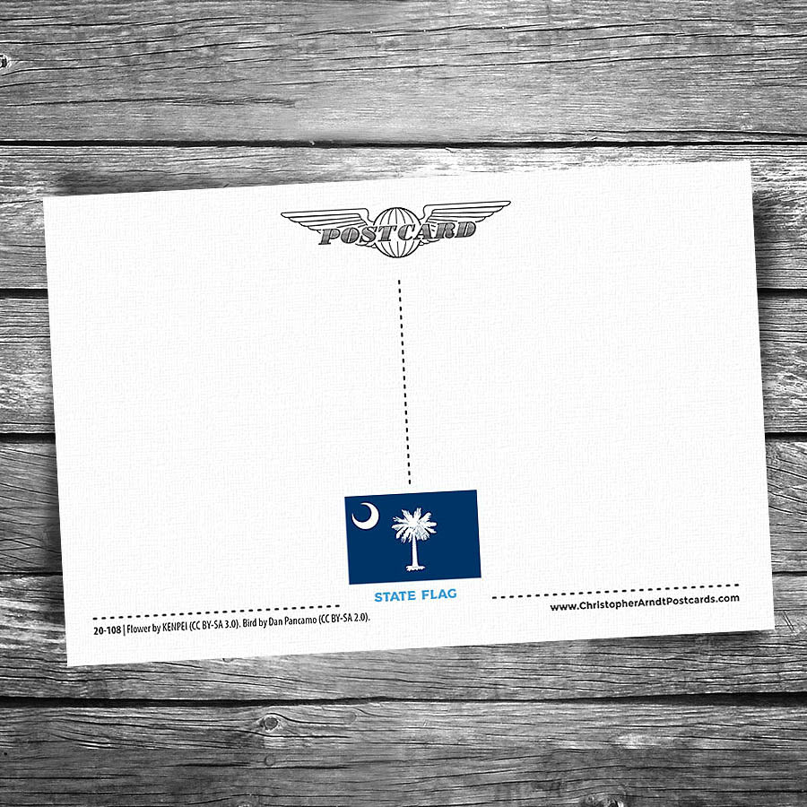 Large letter "Greetings From" South Carolina postcard featuring fun facts & trivia – plus the state flower, bird, and flag in a vibrant patriotic design.
