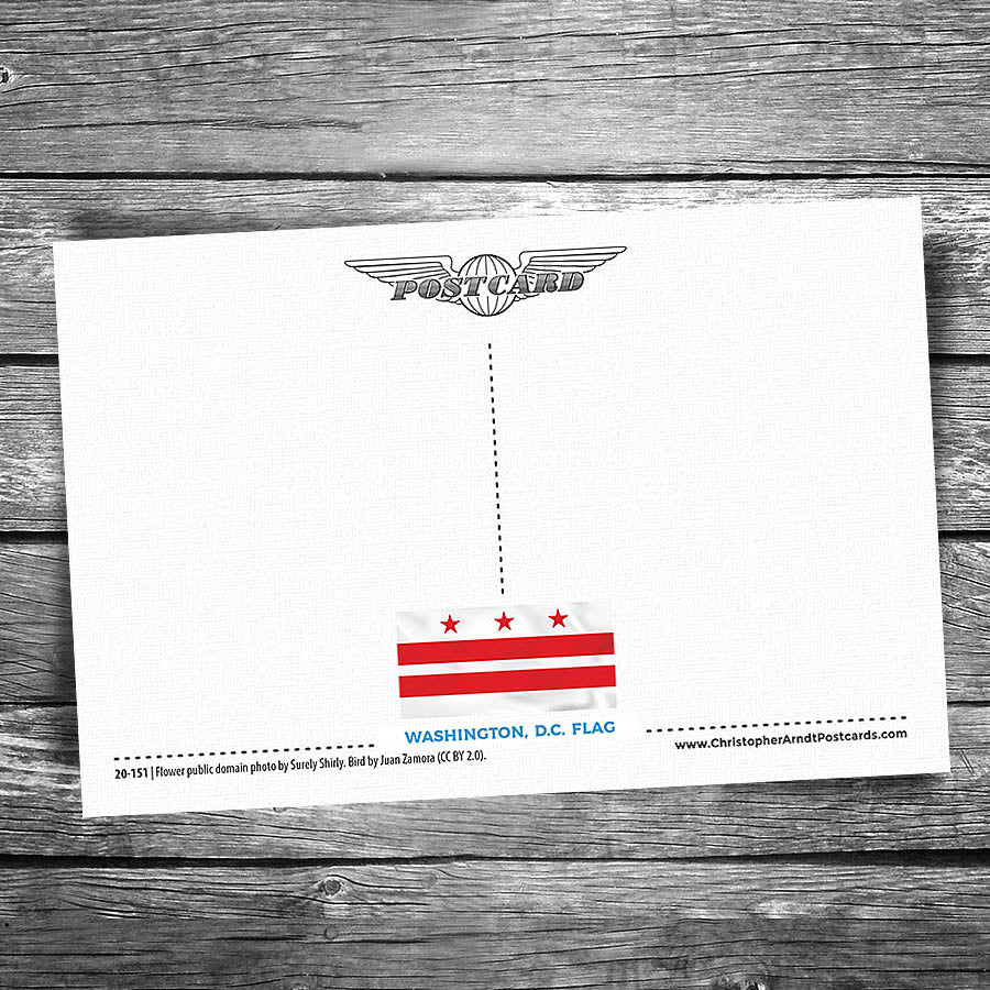 Large letter "Greetings From" Washington, DC postcard featuring fun facts & trivia – plus the state flower, bird, and flag in a vibrant patriotic design.