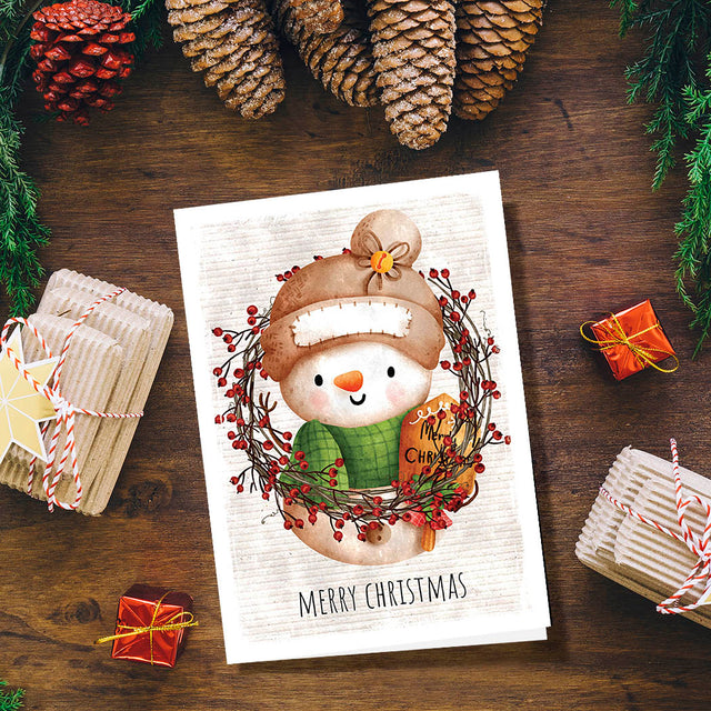 Featuring an adorable pudgy snowman wrapped in a country wreath of red berries, this card is sure to bring a smile to the face of anyone who receives it.