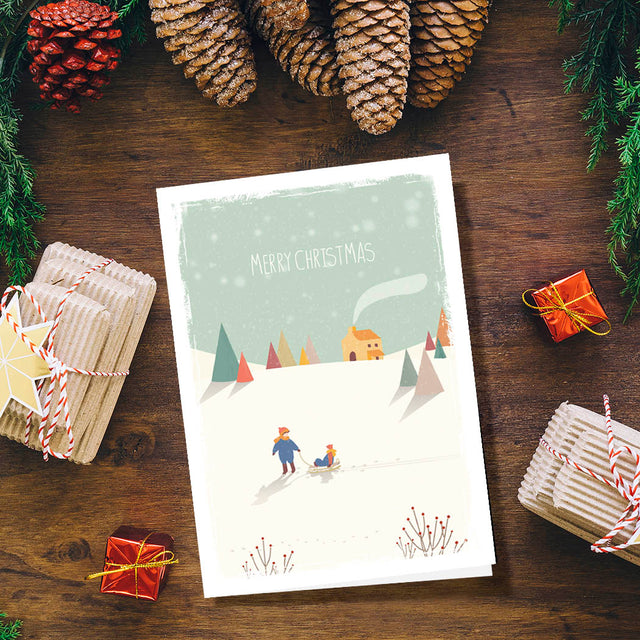 Share some holiday cheer with our charming Christmas card! This delightful design features a simple country setting with two children sledding in a winter wonderland.