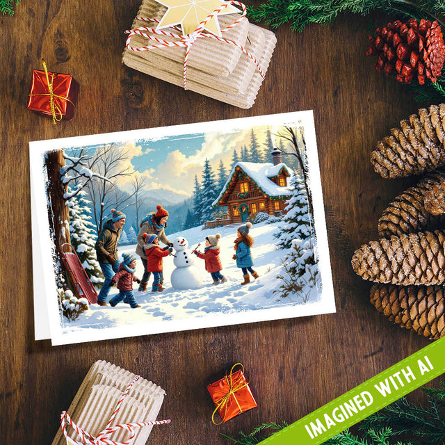 Experience the joy of winter with this heartwarming card featuring a family delighting in a snowy day. As they build a cheerful snowman, laughter fills the air, capturing the essence of togetherness and holiday spirit.