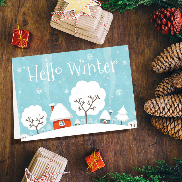 Delight family and friends with this charming winter illustration, featuring a cozy village scene and the words "Hello Winter" written above in a playful font.