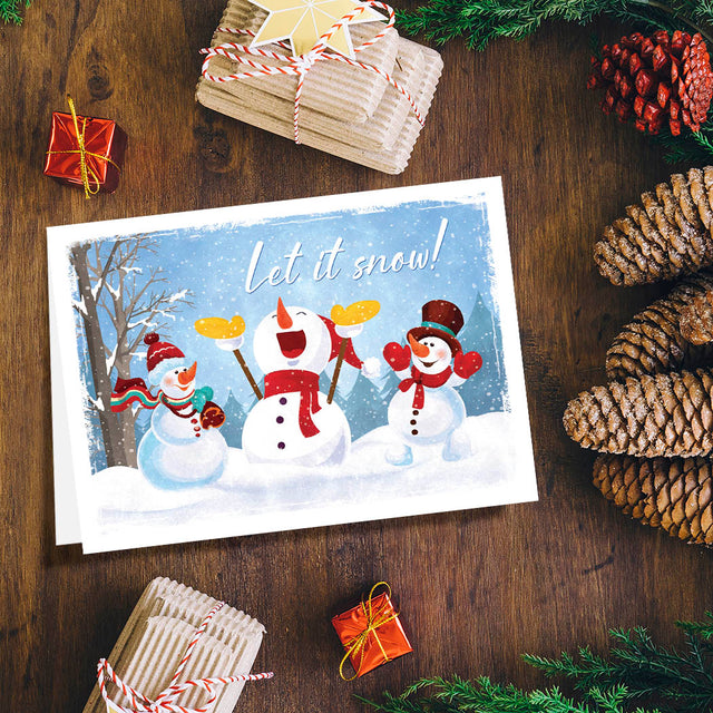 Get ready for the winter wonderland with this whimsical snowman "Let it snow!" card. Featuring three cheerful snowmen who just can't contain their excitement for the upcoming snowfall, this design is sure to delight your family and friends.